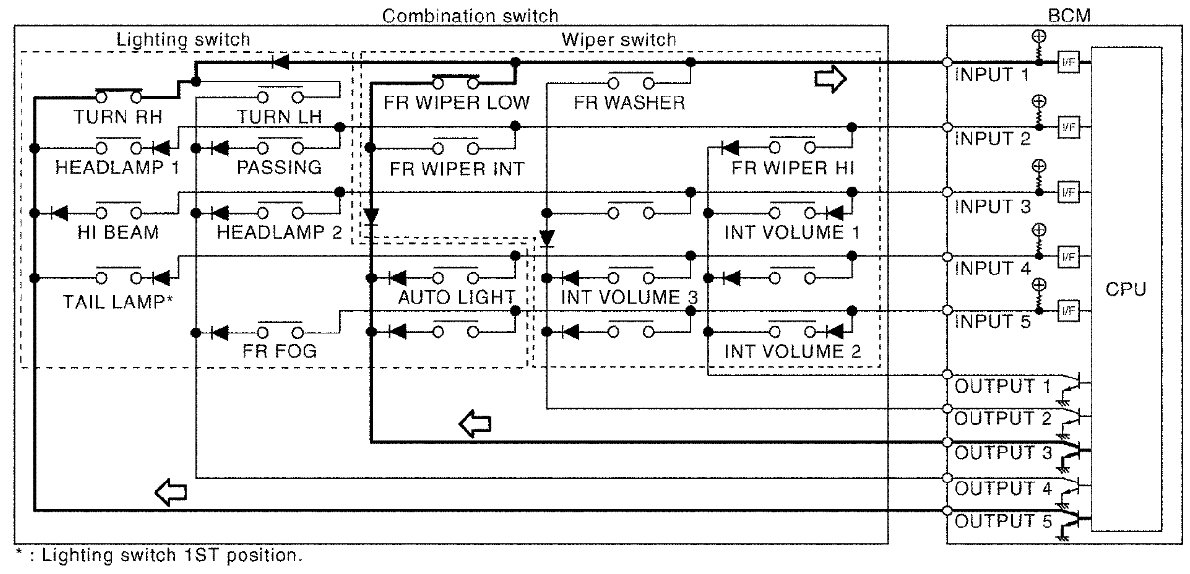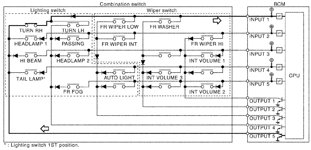 - BCM detects the combination switch status signal "1CE" when the signals of OUTPUT 3 and OUTPUT 5 are input to INPUT 1.
