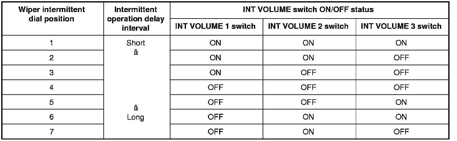 BCM judges the wiper intermittent dial 1 - 7 by the status of INT VOLUME 1, 2 and 3 switches.