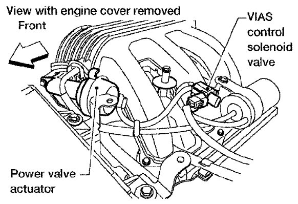 2 Check hoses and tubes between intake manifold and power valve actuator for cracks, clogging, improper connection or disconnection. Refer to [Variable Induction Air System: Vacuum Hose Drawing] [1][2]Diagrams.