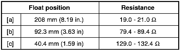 Check resistance between terminals (1) and (2) at each float position [a], [b] and [c].