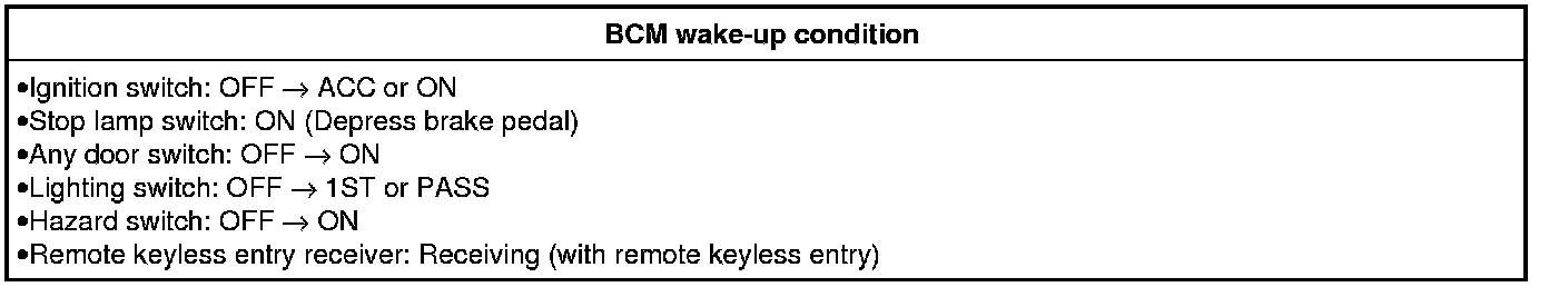 - BCM transmits sleep wake up signal (wake up) to each unit when any condition listed below is established, and then goes into normal mode from low power consumption mode.