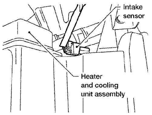 The intake sensor is located on the top of the heater and cooling unit assembly next to the A/C evaporator cover.