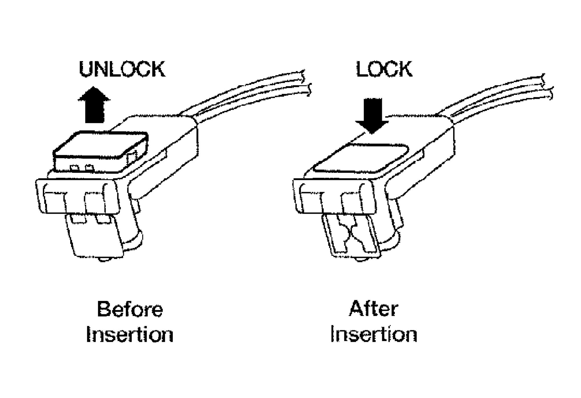 ^ Always push down to lock black locking tab afte4r installing connector to SRS components. When locked, the black locking tab is level with the connector housing.