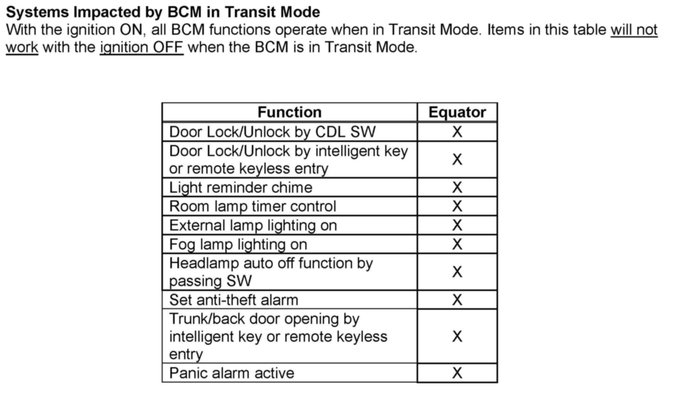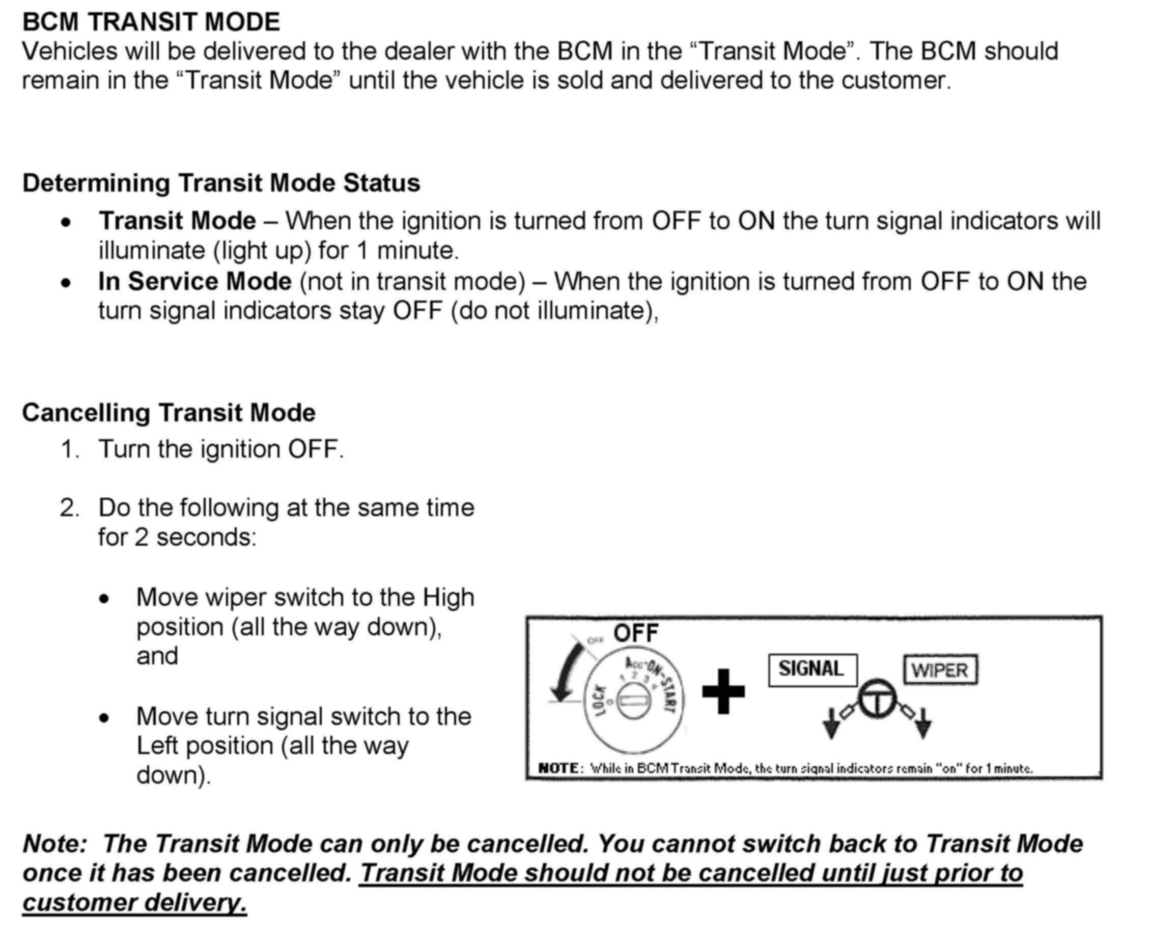 EXTENDED STORAGE SWITCH/BCM TRANSIT MODE