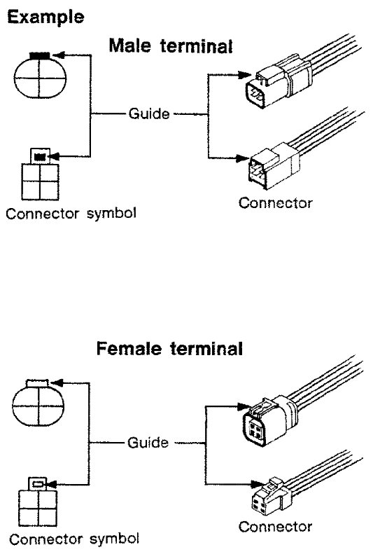 Connector guides for male terminals are shown in black and female terminals in white in wiring diagrams.