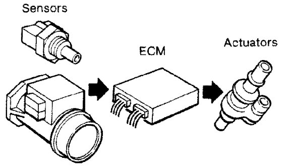 The engine has an ECM to control major systems such as fuel control, ignition control, idle air control system, etc. The ECM accepts input signals from sensors and instantly drives actuators. It is essential that both input and output signals are proper and stable. At the same time, it is important that there are no malfunctions such as vacuum leaks, fouled spark plugs, or other malfunctions with the engine.