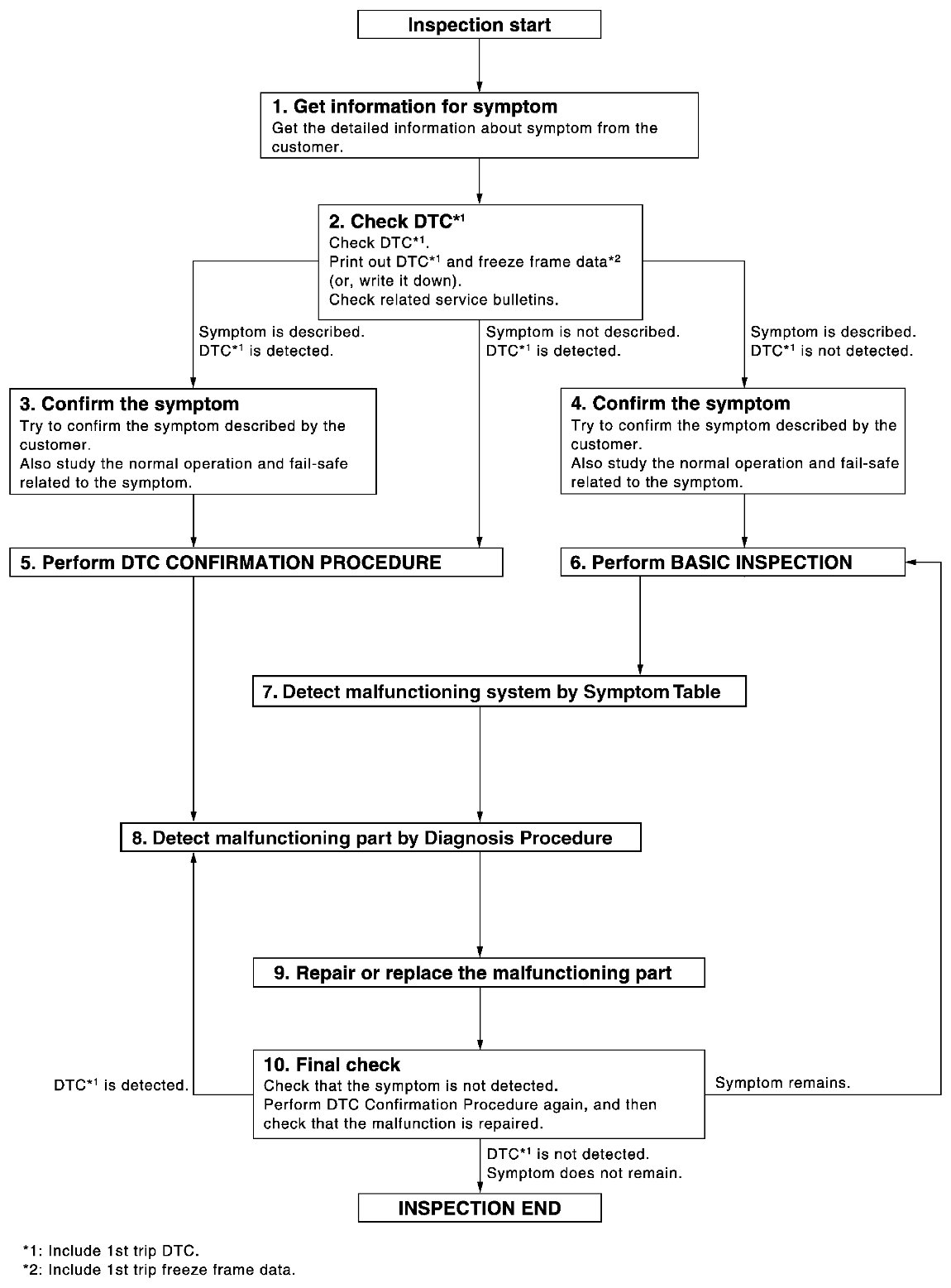 - Study the relationship between the cause detected by DTC*1and the symptom described by the customer. (Symptom Matrix Chart is useful. Refer to [Engine Control System Symptoms: Symptom Matrix Chart] Symptom Related Diagnostic Procedures.)