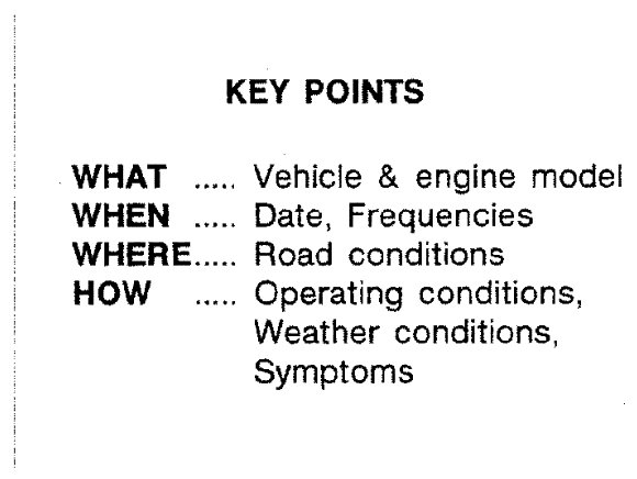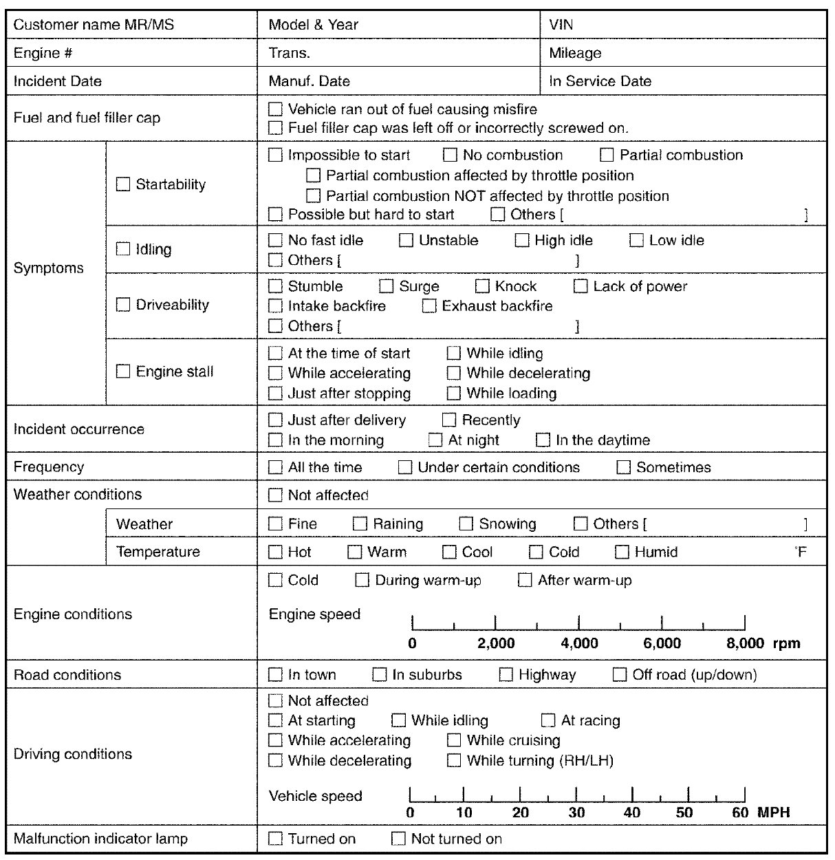 Before undertaking actual checks, take a few minutes to talk with a customer who approaches with a driveability complaint. The customer can supply good information about such incidents, especially intermittent ones. Find out what symptoms are present and under what conditions they occur. A DIAGNOSTIC WORKSHEET like the example on "Worksheet Sample" should be used.