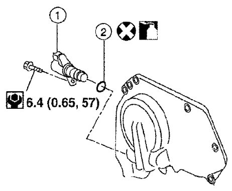 3) Remove intake valve timing control solenoid valve (1) and O-ring (2) from intake valve timing control solenoid valve cover.
