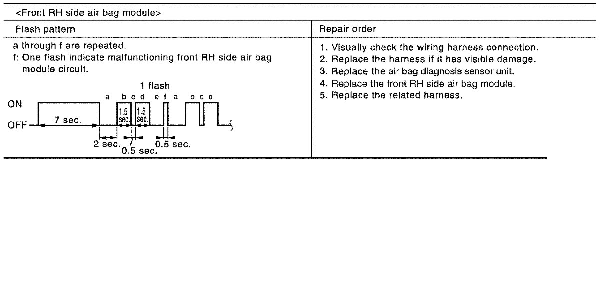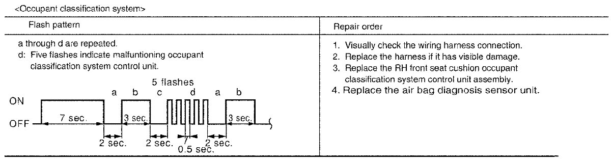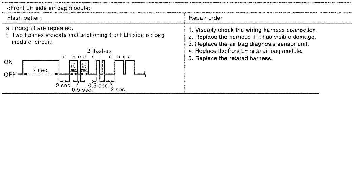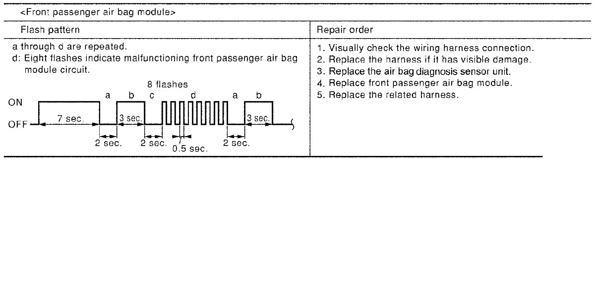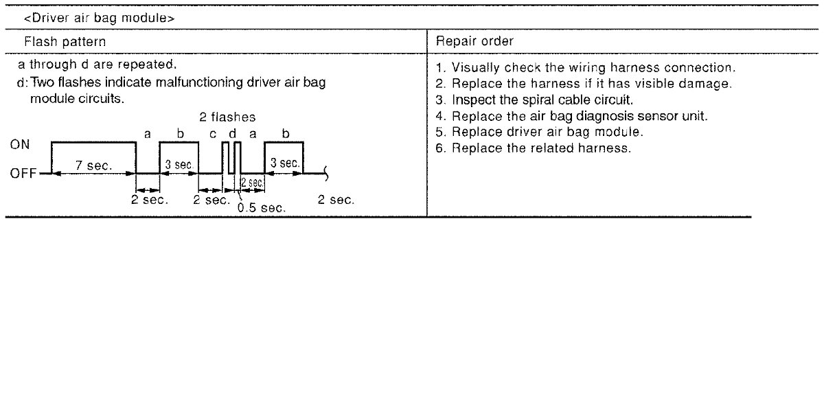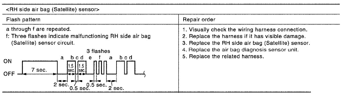 Follow the procedures in numerical order when repairing malfunctioning parts. Confirm whether malfunction is eliminated using air bag warning lamp each time repair is finished. If malfunction is still observed, proceed to the next step. When malfunction is eliminated, further repair work is not required.