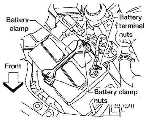 2) Remove battery clamp nuts and battery clamp.