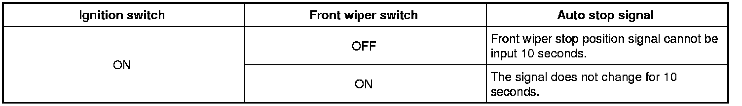 When a front wiper auto stop signal is in the conditions listed below, IPDM E/R stops power supply to wiper after repeating a front wiper 10 second activation and 20 second stop five times.