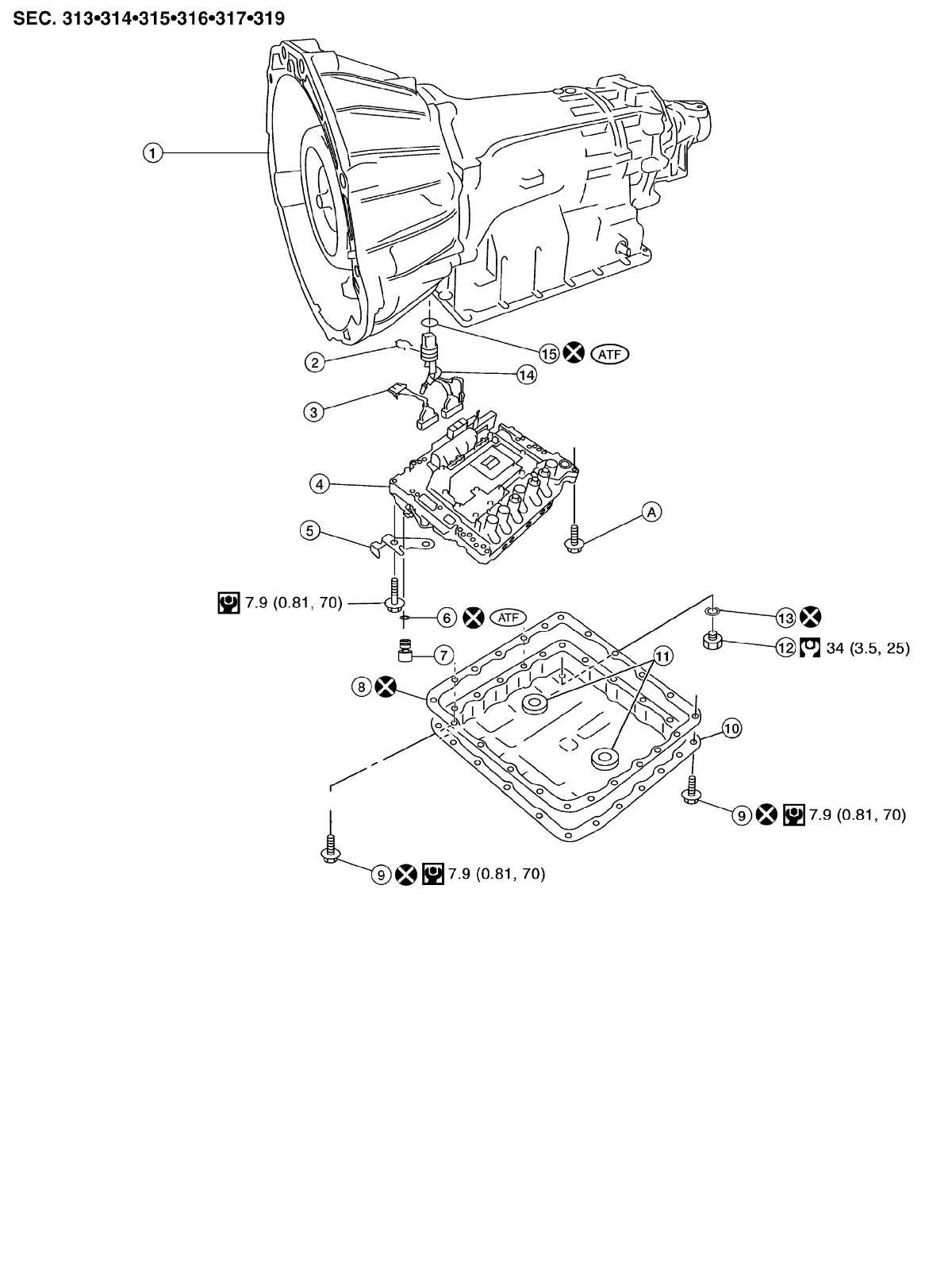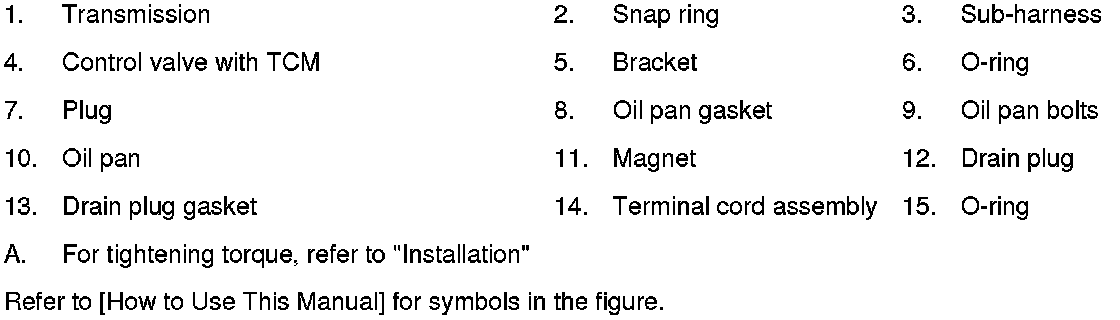 30) Install oil pan to transmission case. Refer to [Oil Pan: Removal and Installation] Service and Repair.