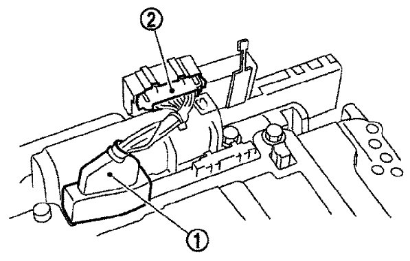17) Disconnect TCM connector (1) and transmission range switch connector (2).
