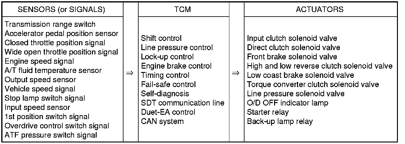 The A/T senses vehicle operating conditions through various sensors or signals. It always controls the optimum shift position and reduces shifting and lock-up shocks.