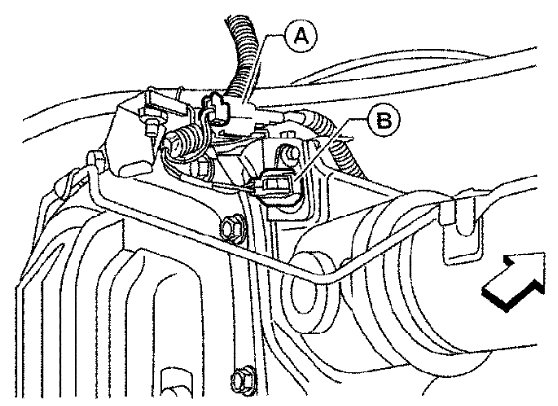 5) Remove differential lock solenoid connector (B) bolt and disconnect differential lock position connector (A).