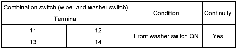 3 Check continuity between the combination switch (wiper and washer switch) terminals.
