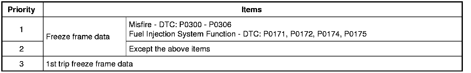 For example, the EGR malfunction (Priority: 2) was detected and the freeze frame data was saved in the 2nd trip. After that when the misfire (Priority: 1) is detected in another trip, the freeze frame data will be updated from the EGR malfunction to the misfire. The 1st trip freeze frame data is updated each time a different malfunction is detected. There is no priority for 1st trip freeze frame data. However, once freeze frame data is stored in the ECM memory, 1st trip freeze data is no longer stored (because only one freeze frame data or 1st trip freeze frame data can be stored in the ECM). If freeze frame data is stored in the ECM memory and freeze frame data with the same priority occurs later, the first (original) freeze frame data remains unchanged in the ECM memory.