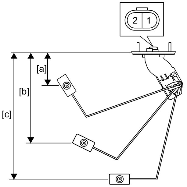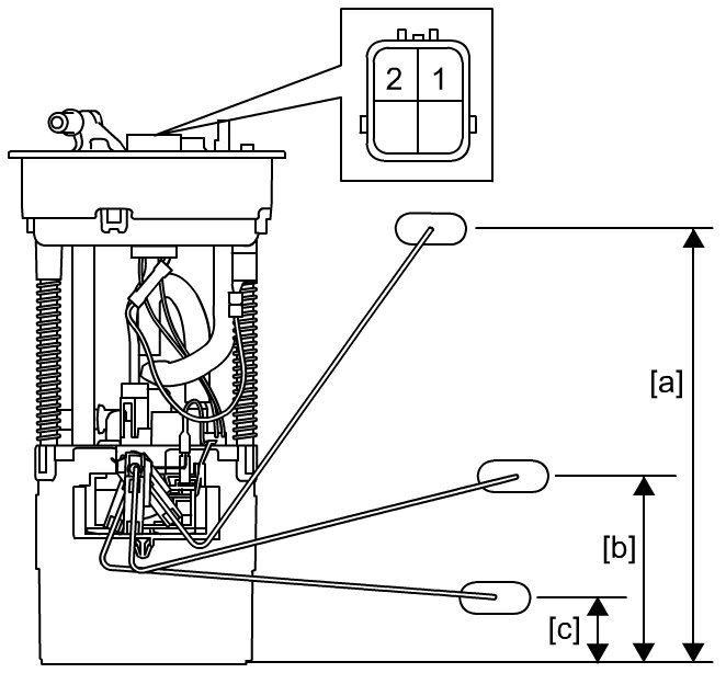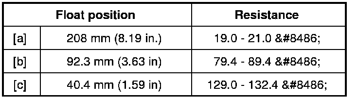 Check resistance between terminals (1) and (2) at each float position [a], [b] and [c].