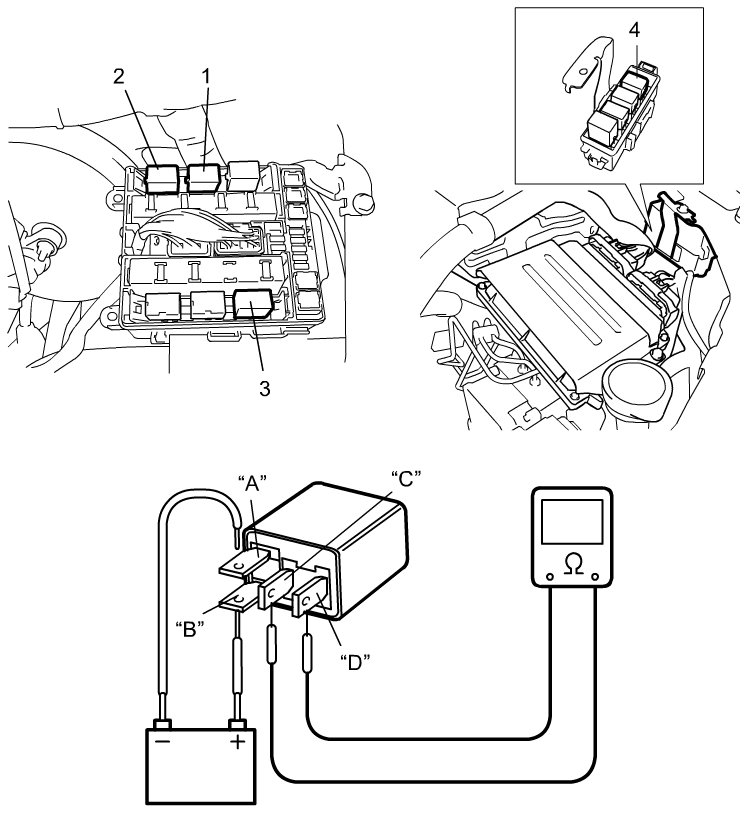 4) Connect battery positive (+) terminal to terminal "B" of relay. Connect battery negative (-) terminal to terminal "A" of relay. Check for continuity between terminals "C" and "D". If there is no continuity, replace relay.