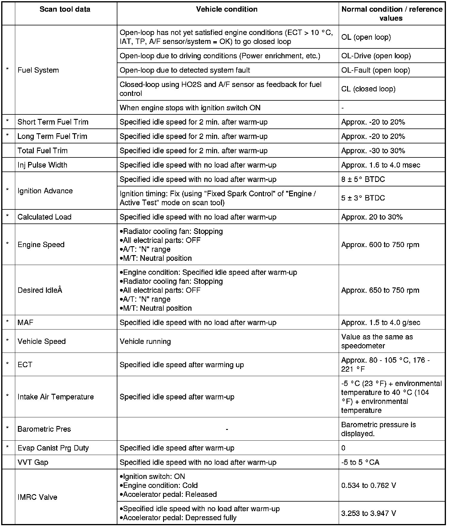 - With the generic scan tool, only star (*) marked data in the following table can be read.