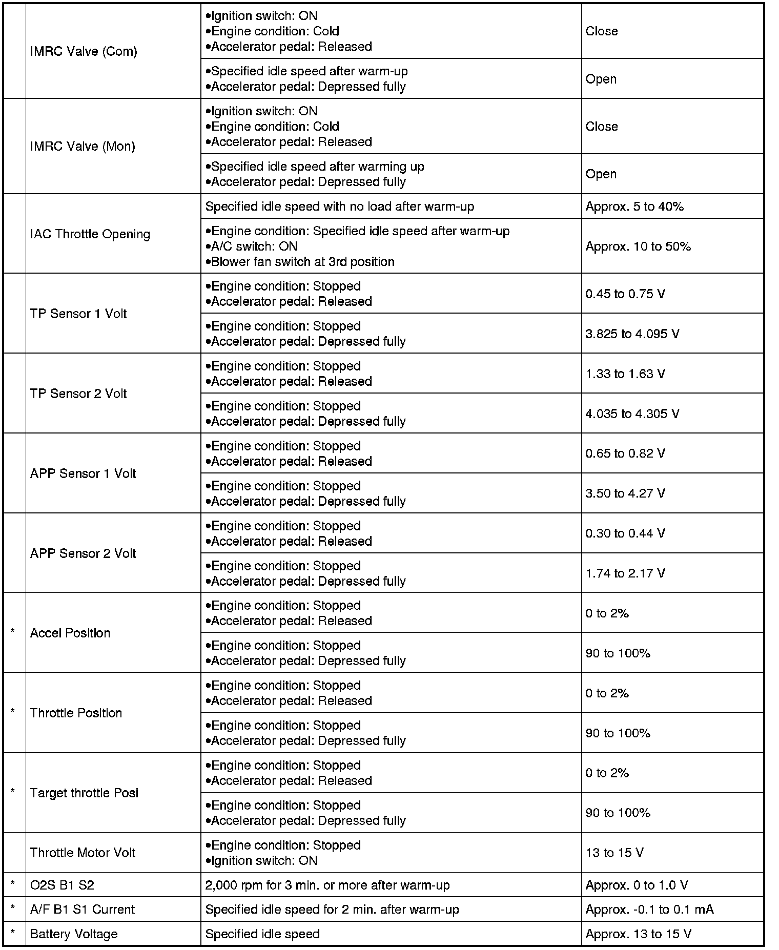 When TP sensor is at fully closed position, throttle opening is indicated as 0 - 5% and 90 - 100% full open position.