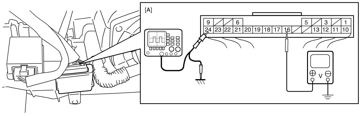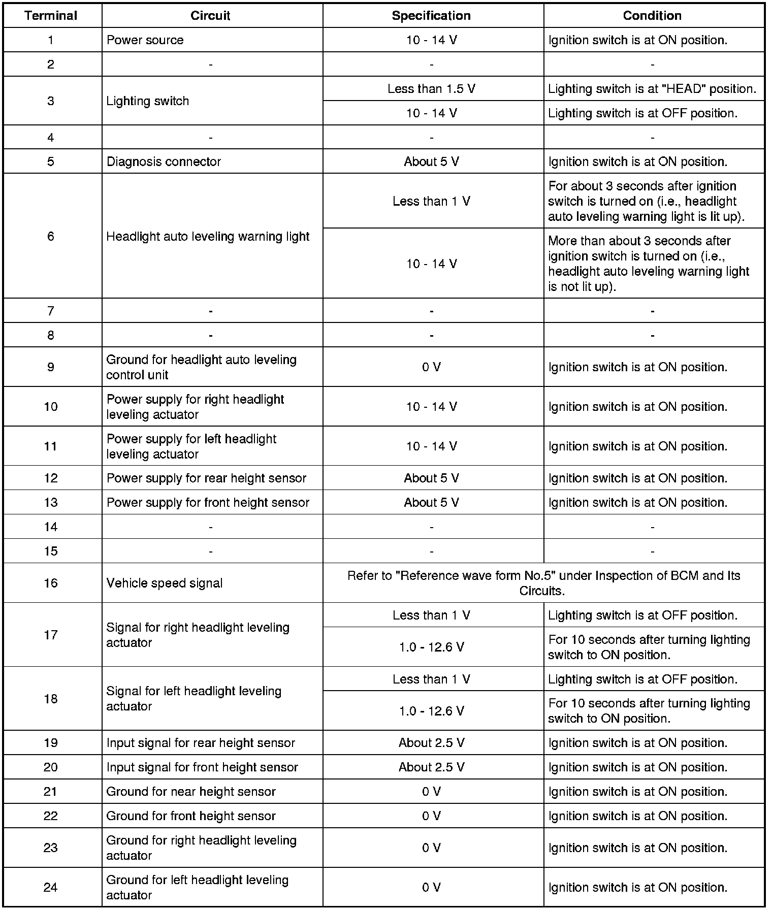 Headlight auto leveling control module and its circuits can be checked at connector terminal of headlight auto leveling control module by measuring voltage and pulse signal.