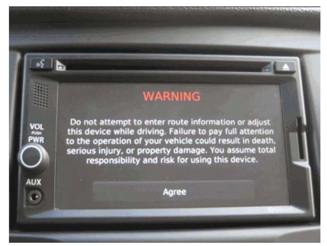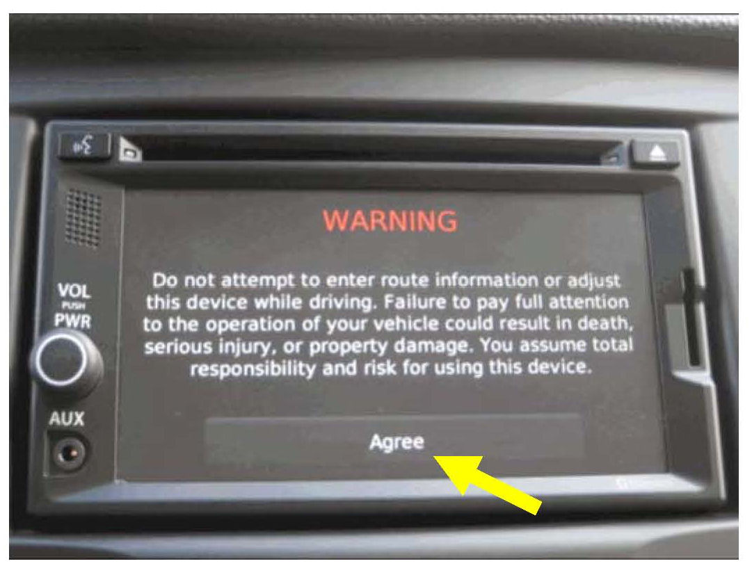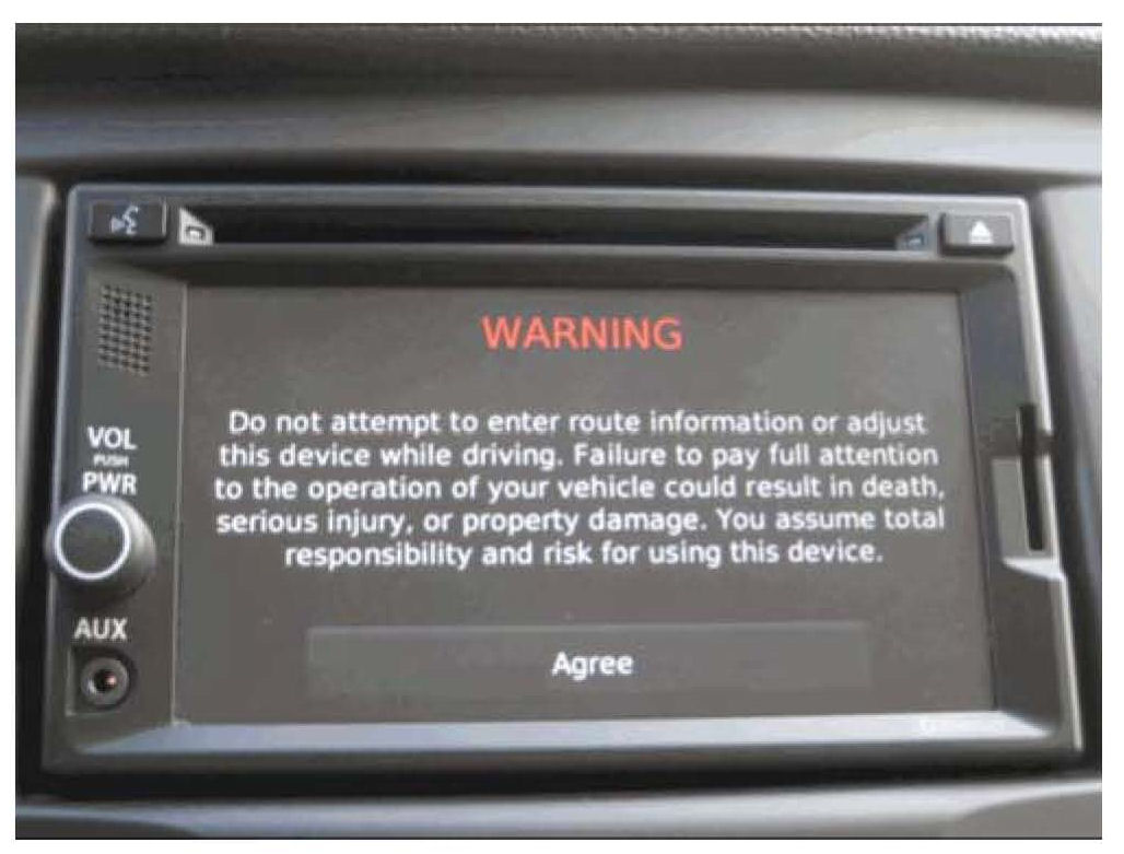 1. Turn ON the Garmin Infotainment System and select the "Agree" option.