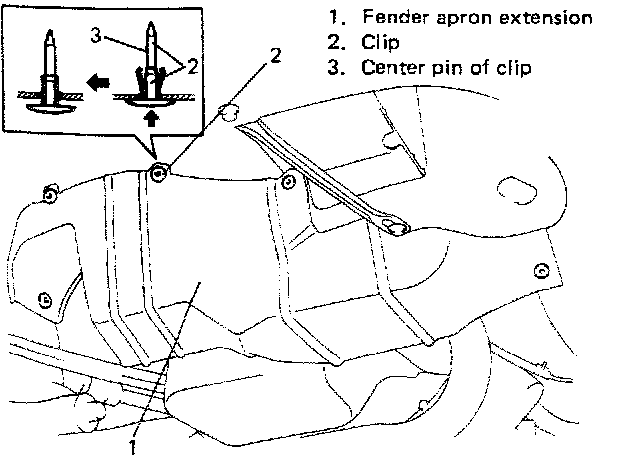 5. Fender apron extension on right side. Remove clip after pushing center pin. But do not push it too far in, or it will fall off into fender.