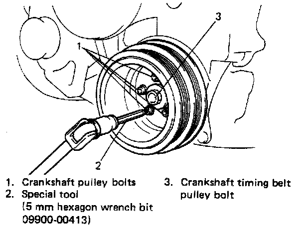 (2) Using special tool (5 mm hexagon wrench bit), loosen crankshaft pulley bolts.