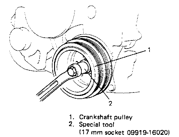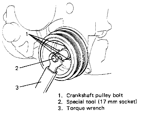 (3) Using special tool (17 mm socket), remove crankshaft timing belt pulley bolt and crank shaft pulley.