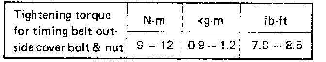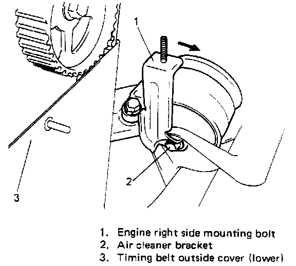 8. Timing belt outside covers (upper & lower). To facilitate cover removal, loosen engine right side mounting bolt and push air cleaner bracket to the right.