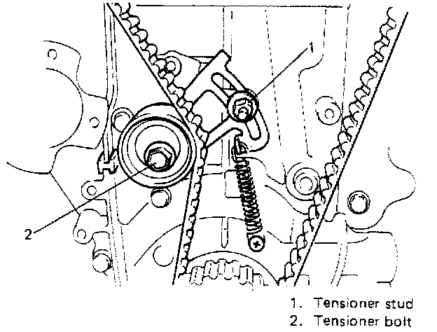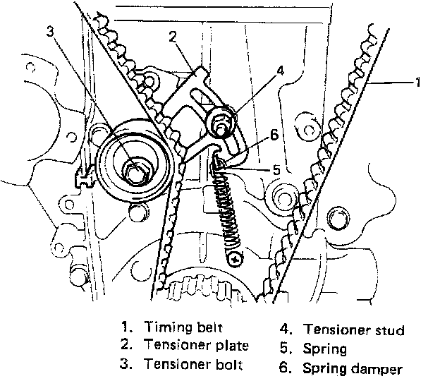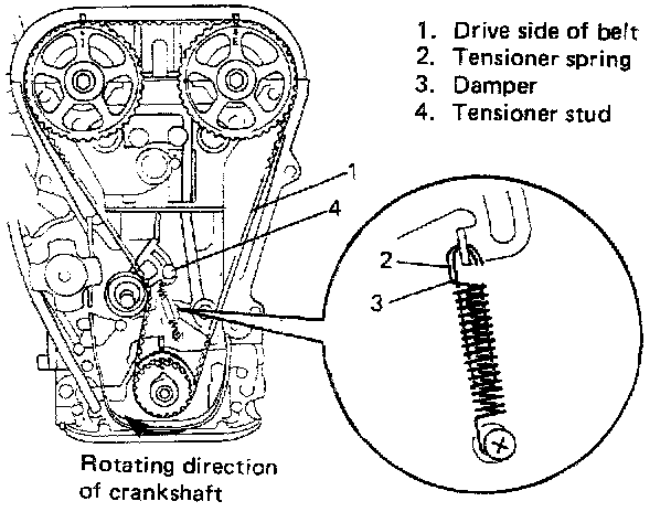 5. Timing belt, tensioner spring and damper. With three sets of marks aligned and tensioner plate pushed up, install timing belt on three pulleys in such a way that drive side of belt is free from any slack. Install tensioner spring and spring damper. Hand - tighten tensioner stud.
