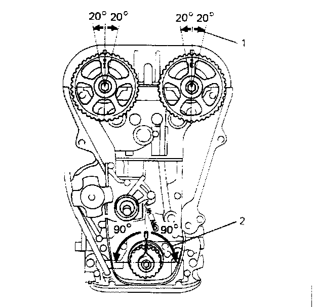 - After timing belt is removed, never turn intake camshaft, exhaust camshaft and crankshaft independently more than such an extent as shown below. If turned, interference may occur between pistons and valves and parts related to piston and valves may be damaged.