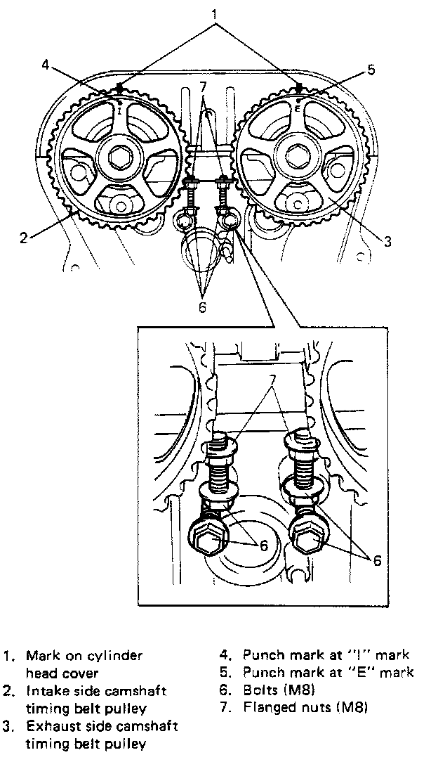 3. Turn camshaft timing belt pulleys (INTAKE AND EXHAUST) so that punch mark "I" on intake side camshaft timing belt pulley is aligned with mark on cylinder head cover, and punch mark "E" on exhaust side camshaft timing belt pulley is aligned with mark on cylinder head cover, but don't turn each pulley beyond the allowable turning range.