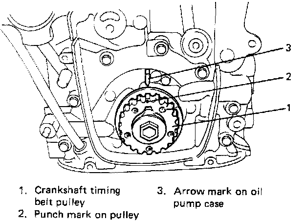 4. Check that punch mark on crankshaft timing belt pulley is aligned with arrow mark on oil pump case. if not, align two marks by turning crankshaft but be careful not to turn it more than its allowable turning range.