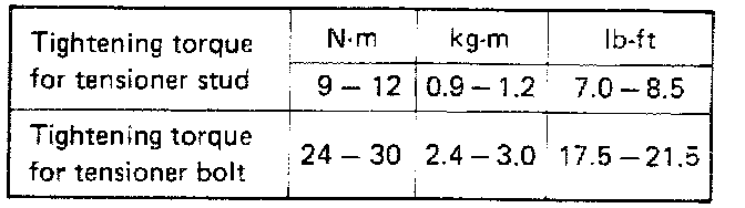 6. To take up slack of timing belt, turn crankshaft two rotations clockwise. After making sure that belt is free from slack, tighten tensioner stud first and then tensioner bolt to each specified torque. Then confirm again that three sets of marks are aligned respectively.
