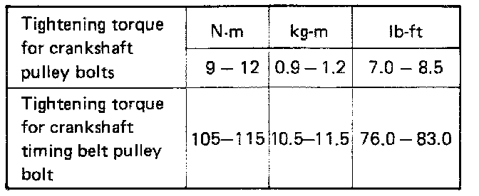 8. Crankshaft pulley. Remove crankshaft timing belt pulley bolt and install crankshaft pulley. With crankshaft locked, tighten crankshaft pulley bolts and crankshaft timing belt pulley bolt to specified torque.