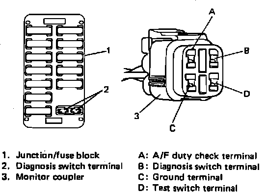 Trouble codes may be accessed by installing a spare fuse into the diagnostic switch terminals of the fuse box or by grounding terminal D of monitor coupler, Fig. 4, and turning the ignition switch to the On position.