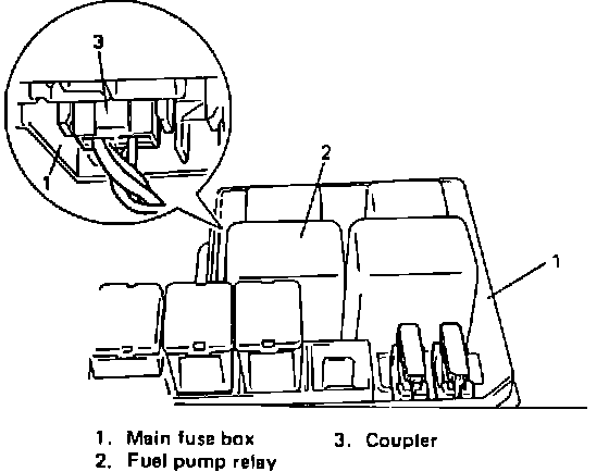 e. Detach main fuse box from body, then disconnect coupler from fuel pump relay, Fig. 59.