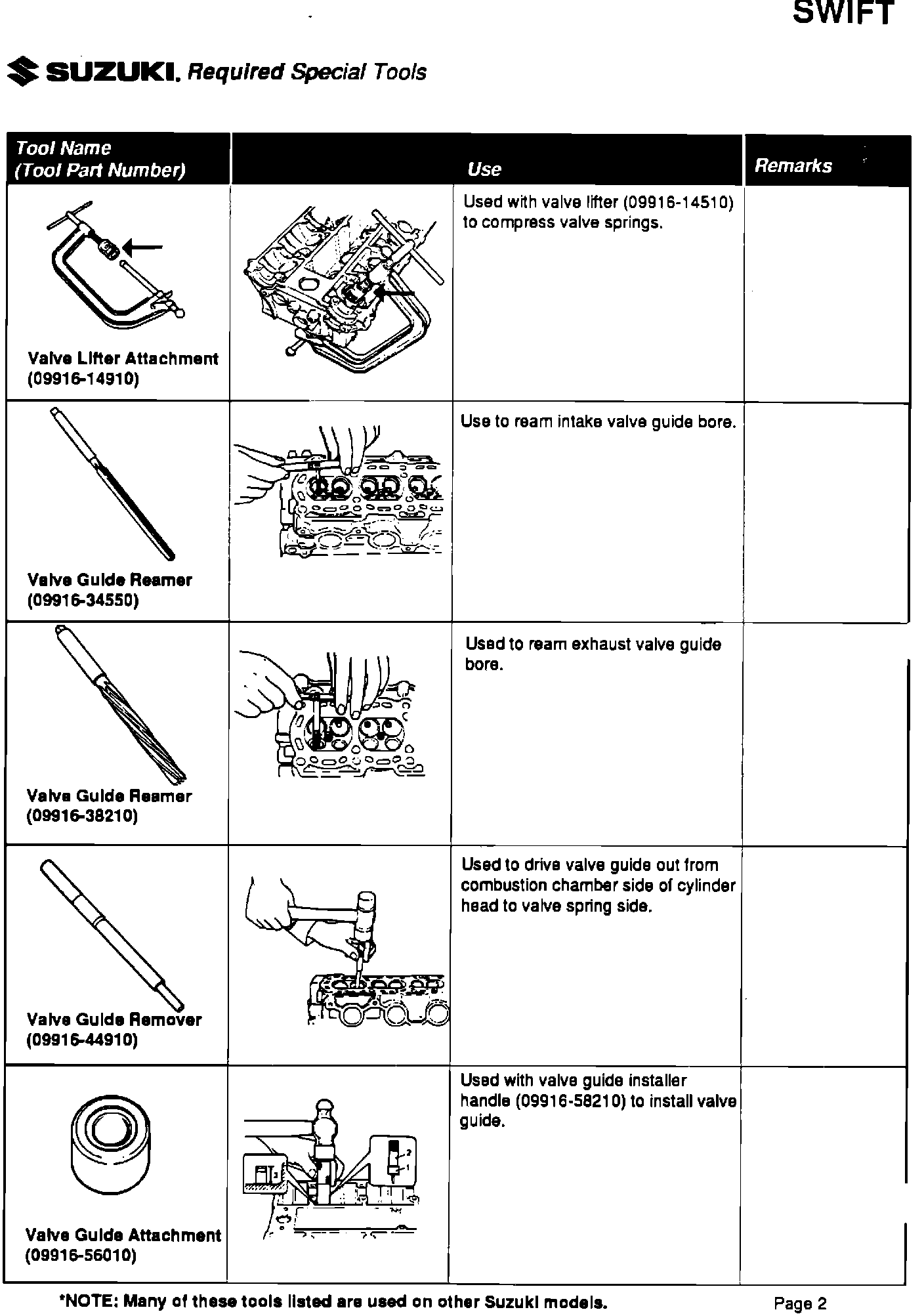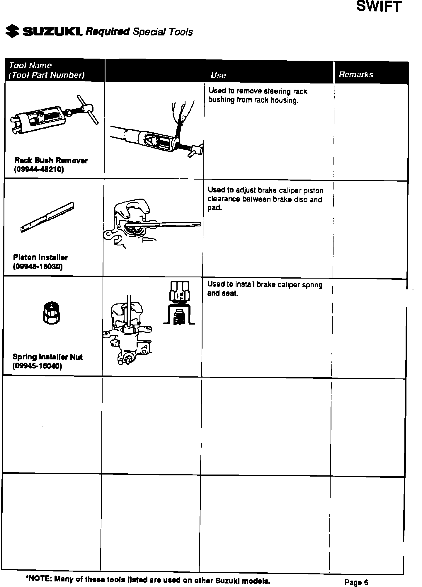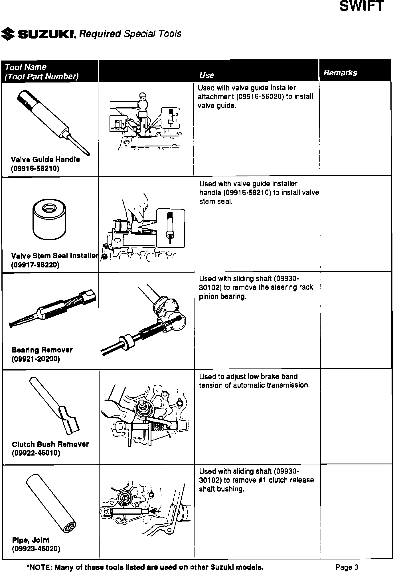 Please be sure your dealership has all the listed special tools, and that they are available to your service technicians. Individual tools can be ordered through Suzuki's parts department by their specific part number.