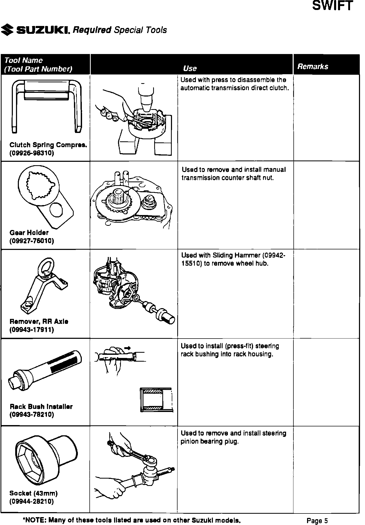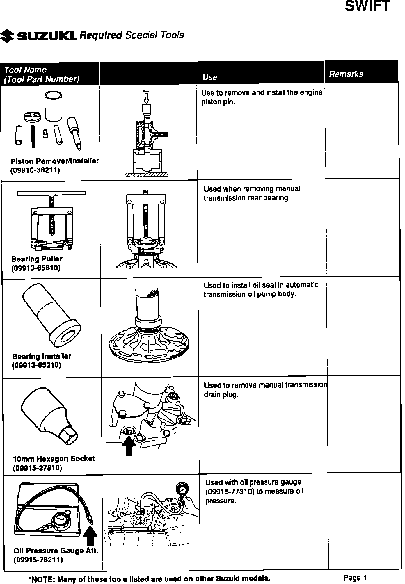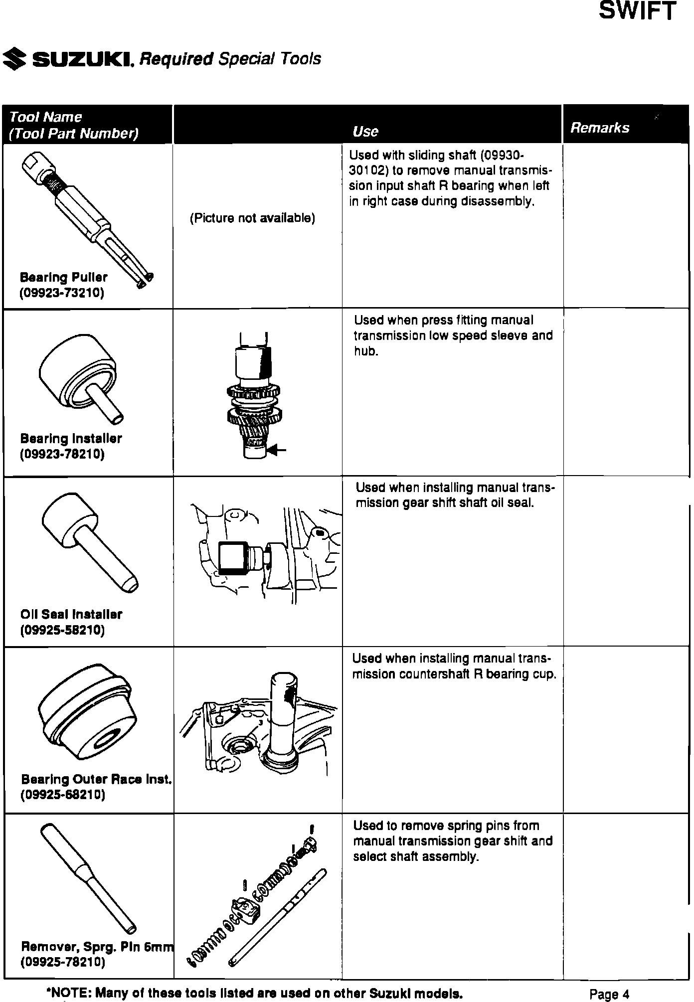 Please be sure your dealership has all the listed special tools, and that they are available to your service technicians. Individual tools can be ordered through Suzuki's parts department by their specific part number.