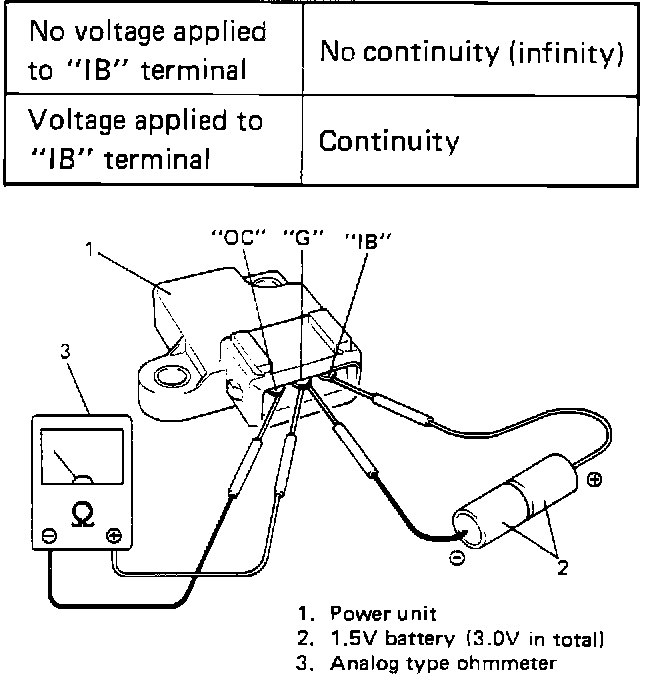 - Connect positive lead of analog ohmmeter to "G" terminal of power unit.