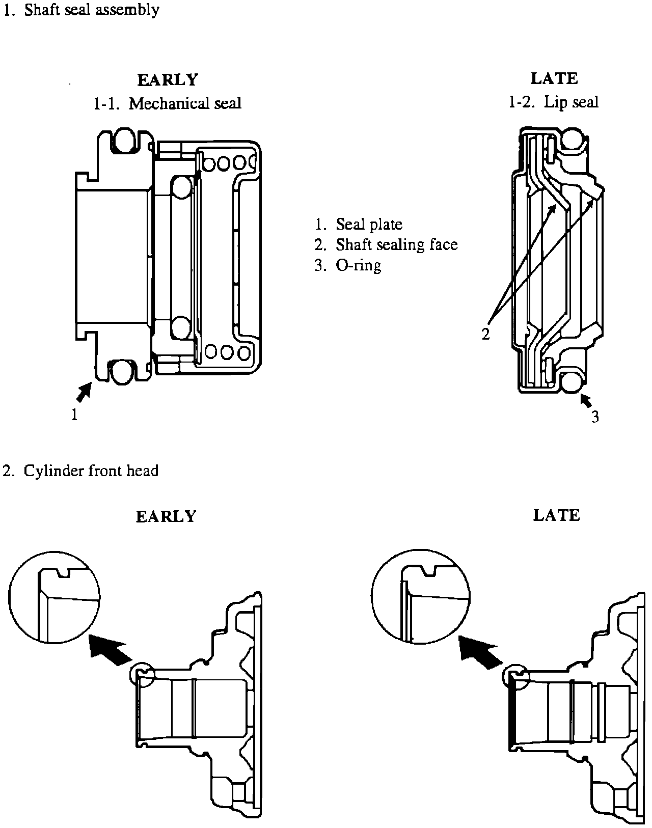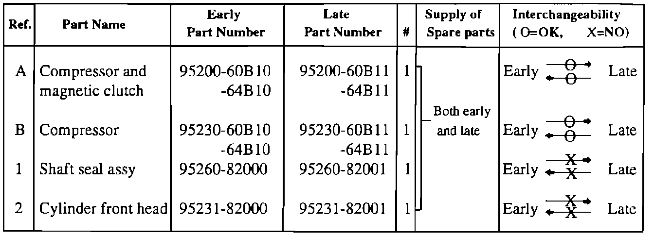Due to the modification of both the cylinder front head and shaft seal assembly, a part of the assembly disassembly procedures and special tools for compressor overhaul have been changed. Therefore, make the necessary corrections in Section 1C "DISASSEMBLY OF COMPRESSOR" for the 1991 Swift Service Manual (99500-64B21) according to the instructions in this bulletin. However, when servicing the early type compressor, refer to the existing information contain in the 1991 Swift Service Manual (99500-64B21).