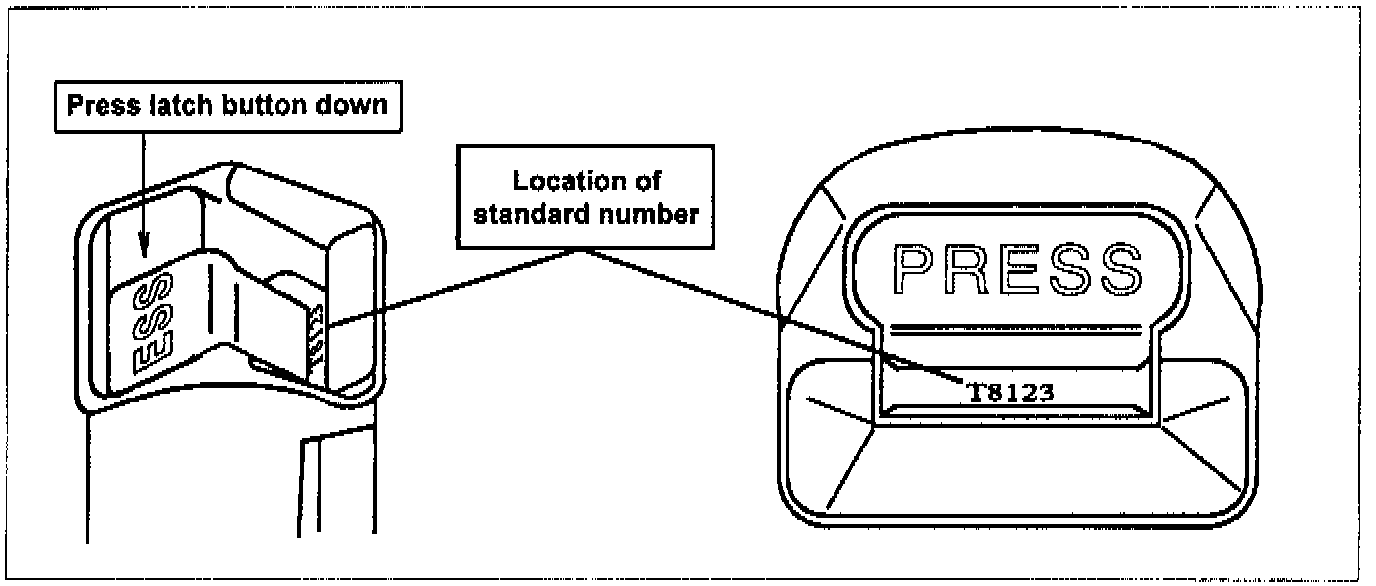If the lot standard number in the buckle latch matches the three (3) digits shown, go to REPLACEMENT. The "T" or "K" may be at the beginning or end of the lot number.