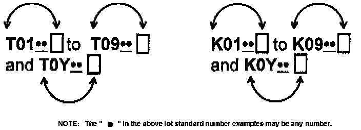 3a. The lot standard number will start or end with a letter "K" or "T" and have four (4) additional digits. If the lot standard number in the buckle latch starts or ends with the "K" or "T" and the first numerical digit is a 7, 8, or 9, go to REPLACEMENT.