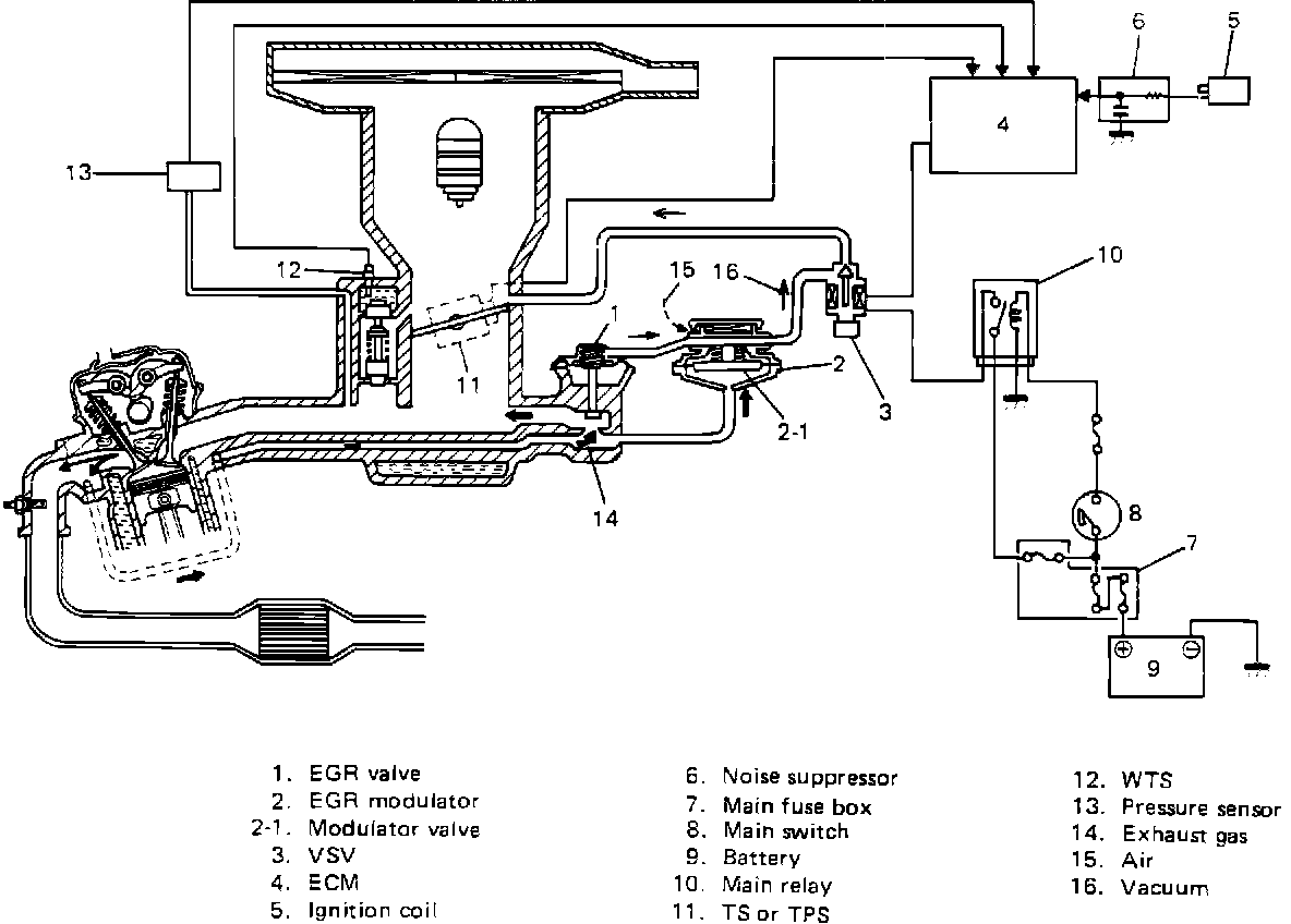 The EGR valve is controlled by EGR modulator and VSV controlled by ECM according to signals from various sensors.