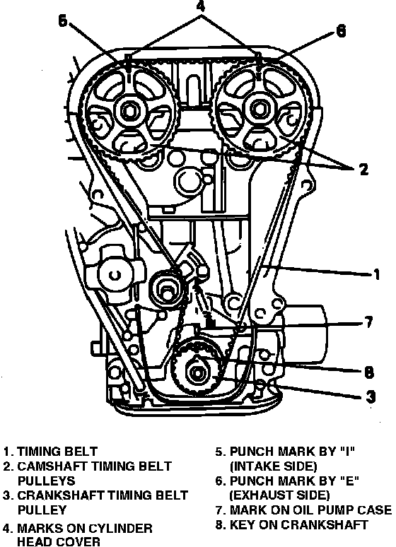7. Turn crankshaft two rotations clockwise after installing belt to take up slack of belt. Ensure marks on all pulleys are aligned.