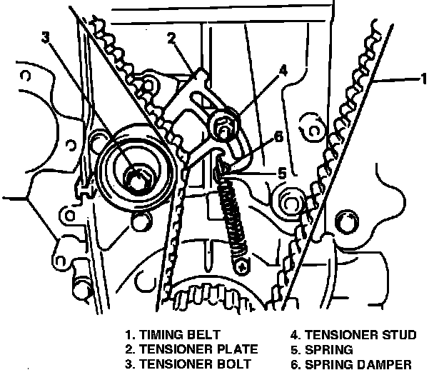 b. Remove tensioner spring and damper, then the timing belt. Once timing belt is removed, never turn camshafts or crankshaft independently more than shown in Fig. 12, or internal engine damage may occur.