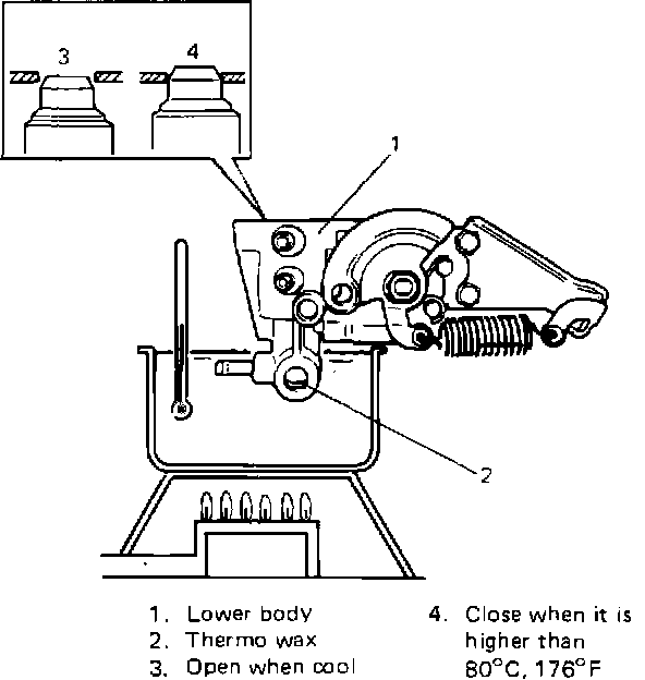 - Immerse air valve of throttle body in water as shown. Check visually that air valve closes gradually as water temperature rises and closes fully at higher than about 8O° C (176° F.)